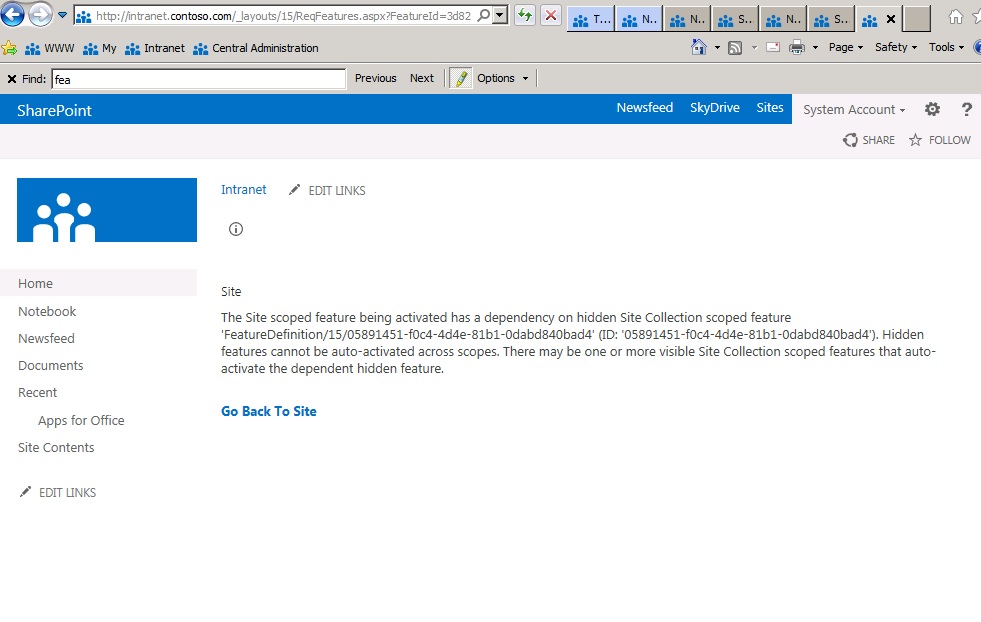 SharePoint 2013. The site feature being activate has a dependency on hidden Site Collection scope Feature November 22, 2012