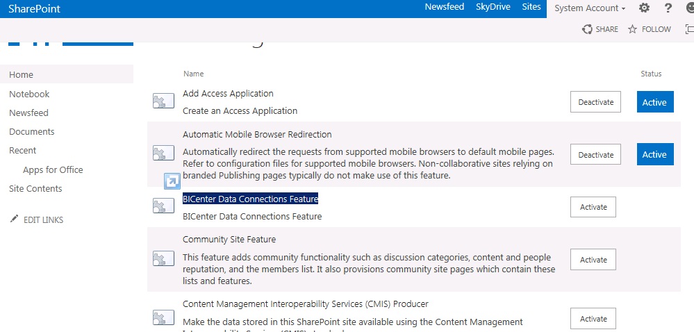 Me puse en la tarea de ver que feature era el que estaba haciendo falta, y encontre BICenter Data Connections Feature,