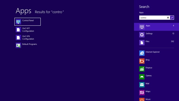 Al iniciar el proceso la primera tarea fue ingresar al Control Panel y aquí descubrí una de las primeras funcionalidades de Windows 8, se le puede dar la tecla Windows y luego escribir directamente lo que queremos y saldrá la ventana de búsqueda de aplicaciones.