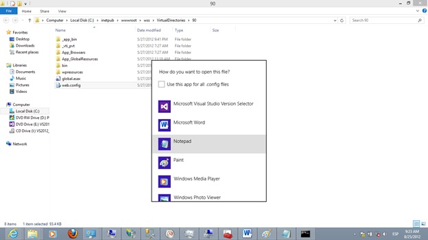 Así que vamos y abrimos el web.config, aquí vemos otra de las nuevas ventanas de Windows 8,